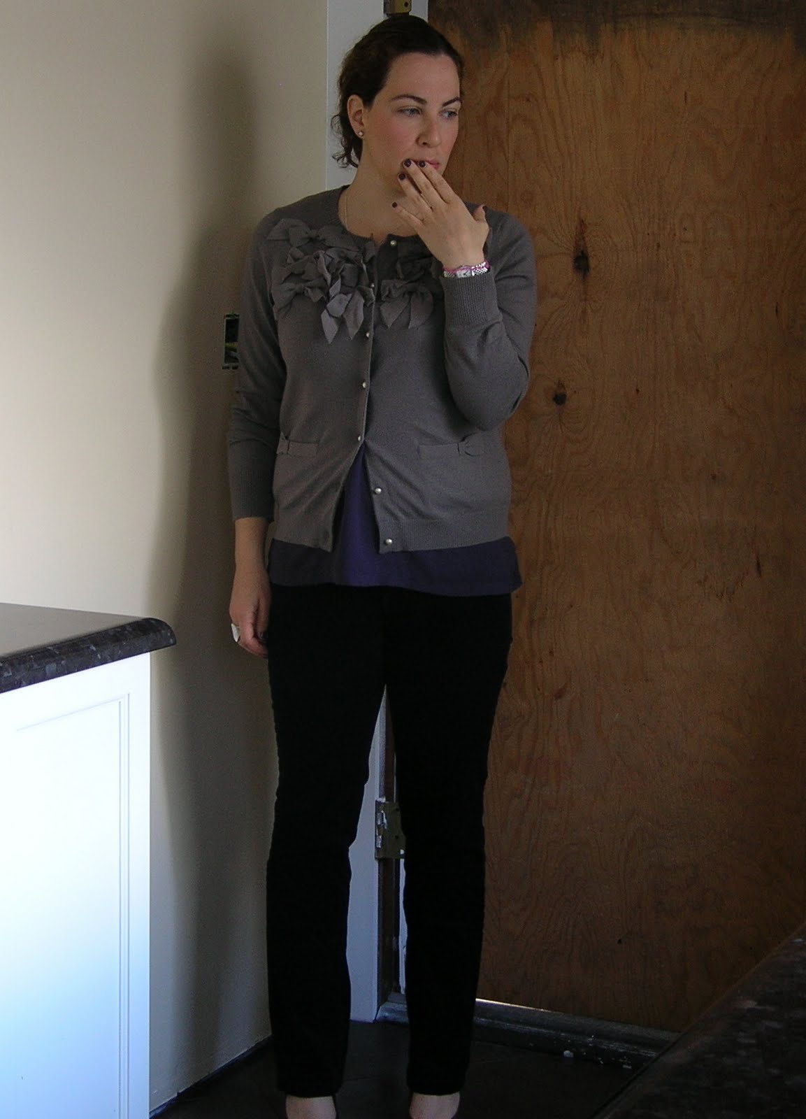 I knew I was ready for a pants day, so I built my outfit around the sweater and my black go to skinny cords (mental high five to Miss P for us coordinating wearing our go to skinny black pants without actually coordinating). I broke out my dark purple top because I really like dark purple and gray as a combo, and the volume of the shirt was just what I needed to go under my cardigan.